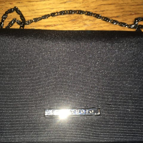 Jeg har til salg en flot sort selskabsdametaske, champagnetaske med sort sløjfe. Den er 17 cm høj og 18 cm bred og har det helt rigtige format til selskabsbrug. Den er i sort velour med et lille håndtag og rem af snoet velour. Tasken har et stort rum og en lille lomme til f.eks. kreditkort. Låsen er en magnetlås. Tasken er fuldstændig som ny.