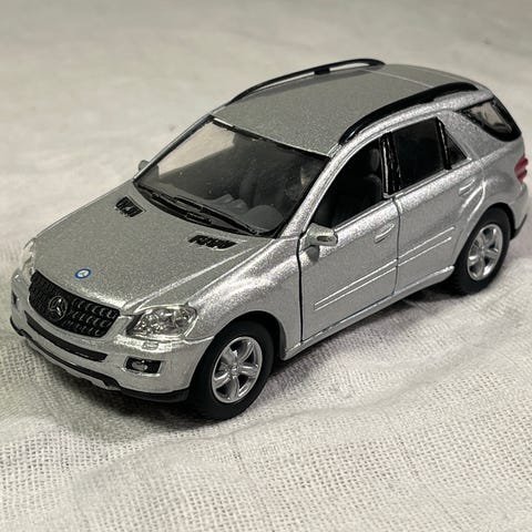 En fin Mercedes-Benz 350 ML-Class der er i sølvmetal farve, dørene kan åbnes i bilen, Mercedes er i en skala 1/36 og kommer fra Kinsmart,