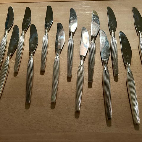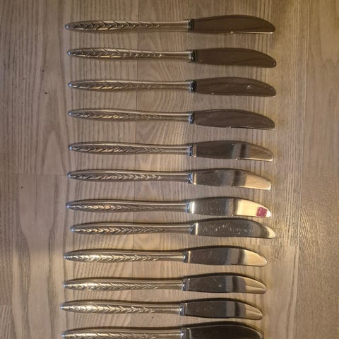 Regent spise-knive i sølvplet fra Victoria. Alle er brugt, men i pæn stand, trænger evt til en pudsning (især en enkelt af dem)