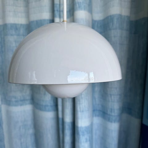 2 stk. flowerpot designet af Verner Panton. Sølges for 1.000 kr pr stk. Lampen har en halvkugleformet skærm i orange farve og ophæng i matchende ledning.