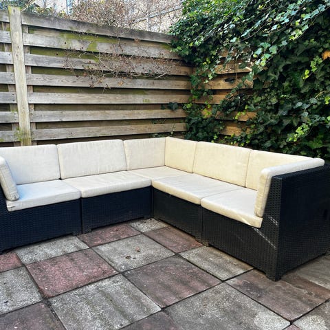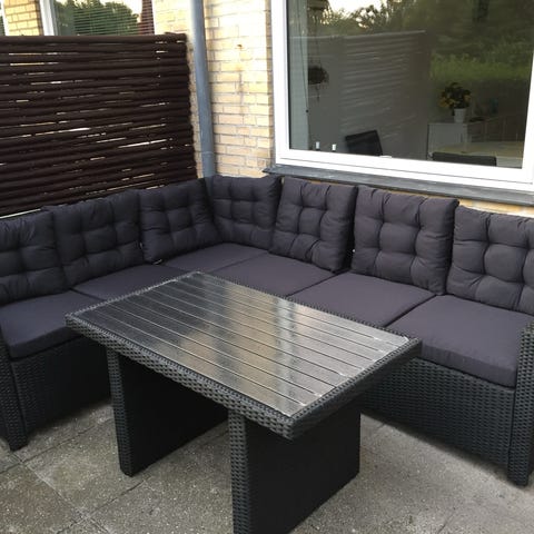 Hjørnesofa til haven i polyrattan med grå hynder. Sofaen har stel i stål og ryg i polyrattan (polyethylen). Sædehøjde er ca. 37 cm, og armlænshøjde er ca. 50 cm. Den samlede størrelse er ca. bredde 113 cm, længde 195 cm og højde 23 cm. Sofaen leveres med matchende grå hynder på sæde og ryg, velegnet til udendørs brug på terrasse, altan eller i have. Vægten er ca. 28 kg.