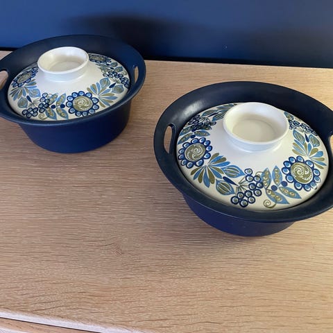 Rörstrand stegepande i keramik/stenlignende materiale med træhåndtag. Panden har blå kant og blomstermønster i blå og grønne nuancer på hvid bund. Rund form med rillet underside. Egnet til brug i køkkenet til stegning og servering. Passer visuelt sammen med øvrige dele i samme serie med tilsvarende dekoration.