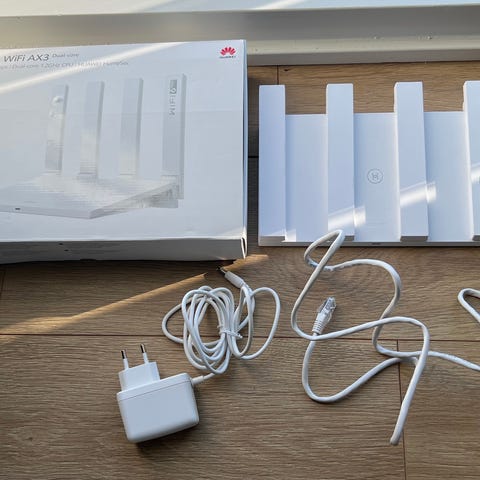 Huawei WiFi Mesh 7 router i hvid farve. Modellen understøtter trådløs netværksforbindelse med en hastighed på op til 6600 Mbps. Enheden leveres med AC-adapter.