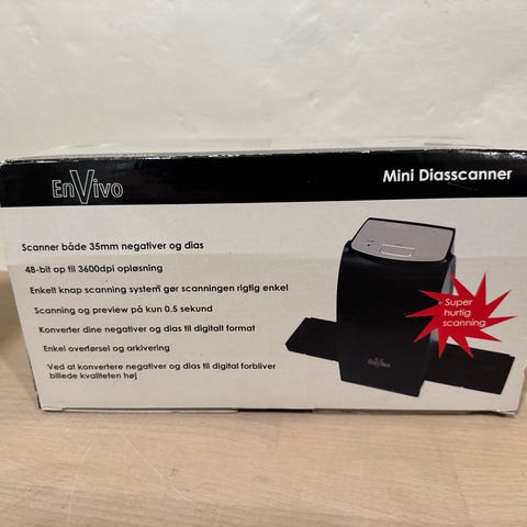 MyGear Film Strip Scanner dias- og negativscanner til 35mm film. Enheden er beregnet til at konvertere 35mm dias og negativer til digitale billedfiler. Scannerens design omfatter holder til filmstrimler og dias, samt tilslutning til computer via medfølgende kabler (jf. original emballage). Velegnet til digitalisering og arkivering af ældre 35mm billedmateriale.