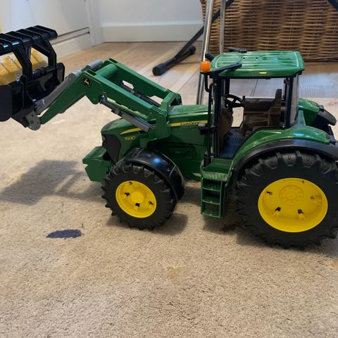 Bruder legetraktor med bælter i grøn plast. Modellen John deere 9620 RX er en landbrugstraktor med detaljeret førerkabine, brede bælter og gule hjulskiver. Traktoren er fremstillet i robust plast og egner sig til leg indendørs og udendørs. Velegnet som landbrugslegetøj til børn, der leger med traktorer og andre maskiner.