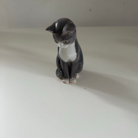 Porcelænsfigur formet som en siddende kat i grå og hvid glasur. Figuren viser katten i en rolig, legende stilling med halen rundt om kroppen. Egnet som dekoration på hylde, reol eller i vitrineskab. Velegnet til samling af dyre- eller kattefigurer i porcelæn.