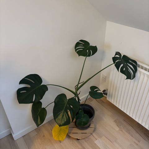 Monstera deliciosa potteplante i grøn. Planten har store, fligede blade og dyrkes som stueplante. Egnet til indendørs placering med indirekte lys. Kræver regelmæssig vanding og trives i almindelig stuetemperatur med sort lerkrukke