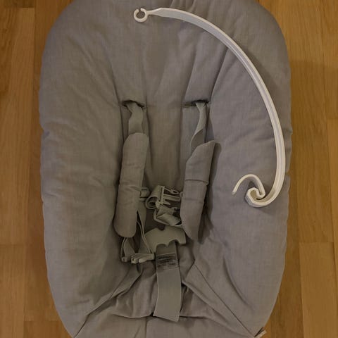 Sædet er designet til brug på Stokke Tripp Trapp højstol og giver en liggende plads til nyfødte. Indsatsen har polstret sæde og integreret sele med spænde for at holde barnet på plads.