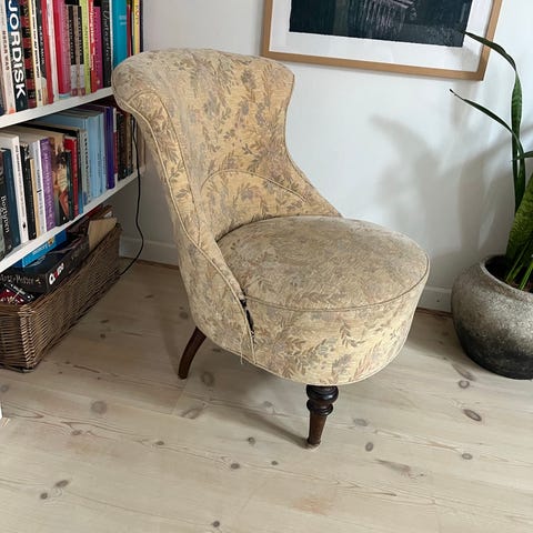Meget smuk håndlavet antik stol i “Windsor” stil. Flot stand, bortset fra det nederste af benene, hvor særligt det ene er medtaget og skal laves, da den ellers står og vipper lidt. Prisen er sat herefter. Som pynt er den fin, som den er.