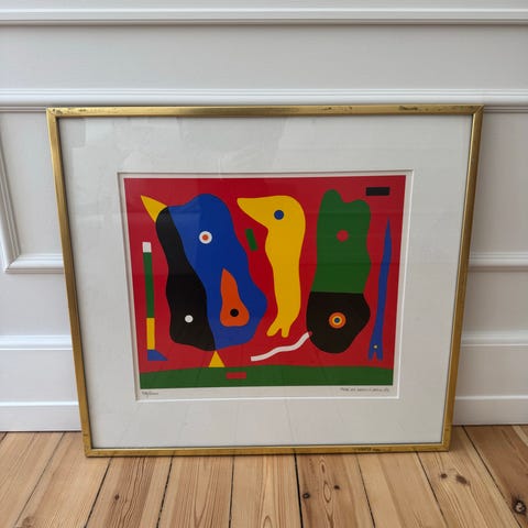 Tonning Rasmussen plakat med abstrakt, farverigt motiv i rød, blå, gul og sort. Motivet er dateret februar 1976 og signeret Tonning Rasmussen. Plakaten er indrammet i en lys træramme. Velegnet som vægdekoration i stue, kontor eller andre opholdsrum, hvor et grafisk og farvestærkt udtryk ønskes.