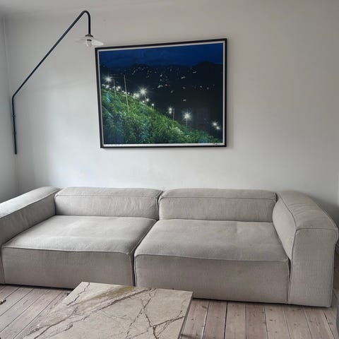 Model Caisa, betræk Nantes, Antracit med både hvide og sorte ben (var ved en fejl monteret med hvide ben, de sorte er efterleveret). Helt ubrugt, kun udpakket til salgsfoto af lejligheden. Incl. 2 Caisa puder 100x35 cm. Nypris incl. puder kr. 17.800 hos Bolia lige nu (kampagnepris)