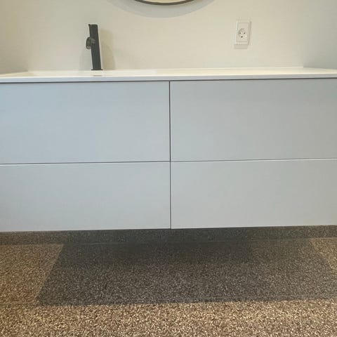 Badeværelsesmøbel fra Svane med integreret vask og hvid bordplade samt skuffemoduler i trælook med push-open. Møblet er væghængt og består af en sektion med vask og opbevaringsskuffe samt en tilstødende lavere sektion med hvid topplade, der kan bruges som siddeplads eller ekstra afsætningsplads. Velegnet til montering på badeværelse, hvor der ønskes kombination af opbevaring og bordplads omkring håndvasken.