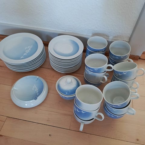stel i blå-hvidt porcelæn. Sættet omfatter tallerkener, kopper med hank, kande og sukkerskål i samme dekoration. Velegnet som kaffestel eller til servering ved borddækning. Klassisk mønster i hvid porcelænsbund med blå dekoration.