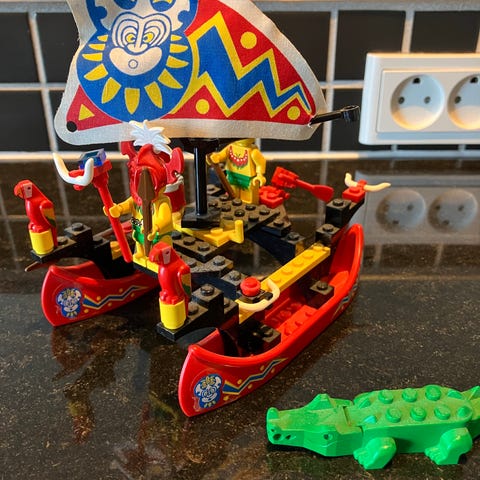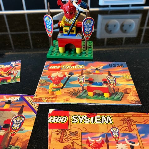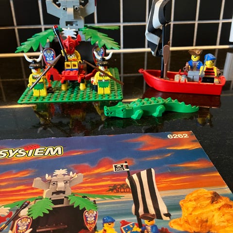 Lego System 6246 byggesæt med lille scene, minifigur og grøn krokodille. Sættet består af en baseplade med bevoksning, hegn med spyd og tilbehør til figuren. Der medfølger trykt byggevejledning til sættet nummer 6246.