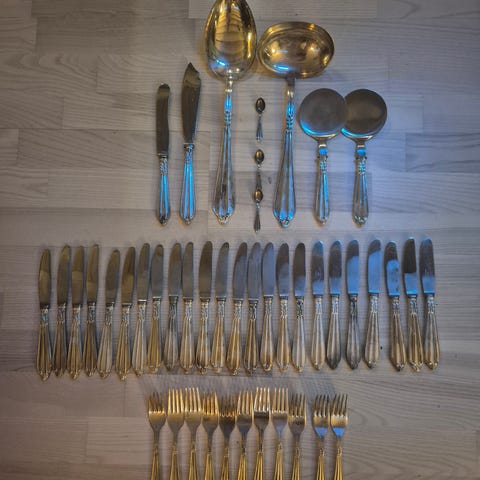 “Krone” bestik i Sølvplet, se priser her i opslaget. Bestikket er i pæn stand, med almindelig brugsspor. Jeg sender gerne.