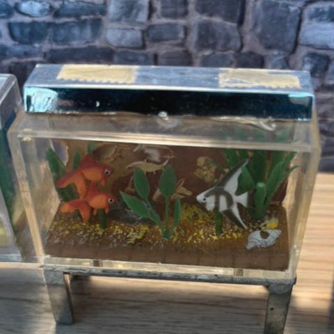 Tre vidunderlige små akvarier uden strøm og vand, og uden levende akvariefisk og akvarierplanter. Til gengæld et smukt lille stykke når nostalgi, der måler 6 × 6 gange cirka to til 3 cm vintage dukkehus pynt
