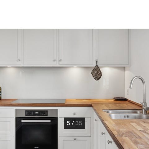 Flot hvidt køkken med træbordplade og hvide fyldningslåger