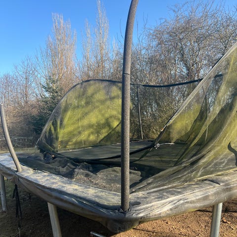 Der er et hul i sikkerheds nettet og den blå kantpude er lidt medtaget ellers er det en fin trampolin som mine børn har haft meget glæde af.
