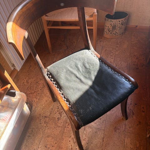 Rød stol. Kan afhentes lørdag 9-13 efter forudgående aftale.