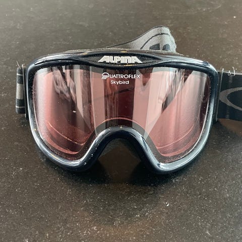 Alpina Quattroflex ski goggles with red-tinted lenses. The goggles have a wide, adjustable elastic strap with Alpina logo and foam padding inside for comfort around the eyes. The lens is curved and covers well around the eyes to protect against wind and snow.