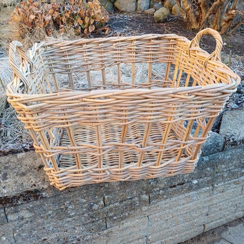 Stor robust flettet kurv. Brugt til brænde. Har ikke umiddelbart nogen fejl og mangler. 52cm i diameter og 42 cm høj inkl hanke. Skal afhentes tæt ved frb alle metrostation.