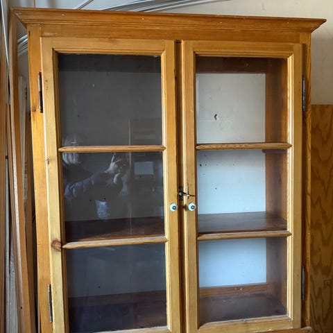 Vintage fyrretræsvitrine fra 1970'erne. Den har en solid træramme lavet af massivt fyrretræ, som fremhæver træets naturlige årer. Vitrinen har 2 glasskydelåger og 2 glashylder.