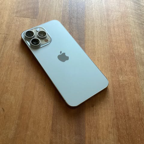 Apple iPhone 15 Pro Max smartphone med 256 GB intern hukommelse. Modellen har stor skærm, tredobbelt bagkamera og frontkamera i skærmens øverste kant. Enheden på billederne fremstår i en grå farvetone. Bagsiden viser synlige ridser og mærker. Velegnet som primær telefon eller som reserveenhed, afhængigt af købers behov og krav til kosmetisk stand.