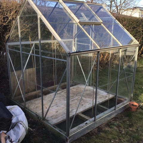 Drivhuset er stabilt og komplet, dør fungerer som den skal. Der er én knust rude i fronten – resten af glasset er helt og i god stand. Sælges derfor til nedsat pris.