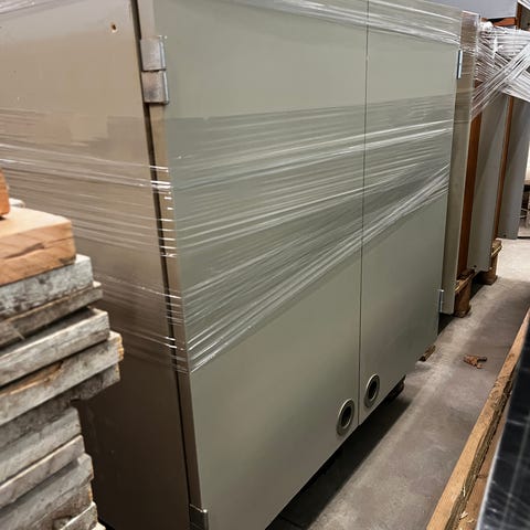 Køkken med skabselementer med træfronter og overskabe med glaslåger. Bordpladerne er i rustfrit stål, og der er integreret kogeplade, ovn og køkkenvask. Indretningen er langsgående med skabe og skuffer i begge sider, hvilket giver god opbevaringsplads. Køkkenet egner sig til montering i et aflangt rum.