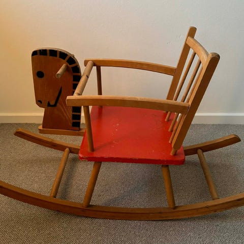 Retro møbel. Vurdering fra 1970’erne. Siddehøjde 24cm. Træ gyngehest stol til børn med ryglæn og armlæn. Sædet er malet rødt, mens stel, meder og hestehoved er i naturfarvet træ. Hestehovedet har en enkel, malet dekoration. Egnet som siddende gyngelegetøj til mindre børn og som indretningsdetalje på børneværelset.