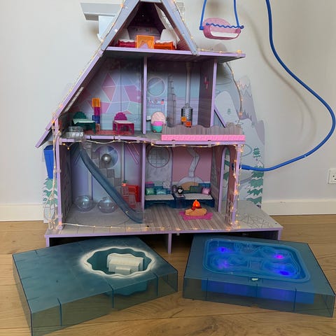L.O.L. Surprise dukkehus med flere etager og åbne rum, velegnet til leg med små dukker. Huset er i flerfarvede pasteller med detaljer som rutsjebaner, elevator og forskellige rumindretninger. Medfølgende tilbehør omfatter møbler som sofa, seng, køkkenmodul, bord, stole, puder og små tilbehørsdele. Der følger også et par L.O.L. Surprise dukker med, som passer i størrelse til huset. Dukkehuset er egnet til indendørs leg og rolleleg for børn, der kan lide at indrette og lege med figurer og tilbehør.