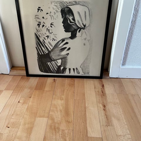 Sikker Hansen billede 61x66 cm. Motivet er udført i en tegnestil med fokus på kontraster og skygger. Billedet er indrammet i en mørk ramme med glas. Velegnet til ophæng i stue, gang eller kontor som vægdekoration.