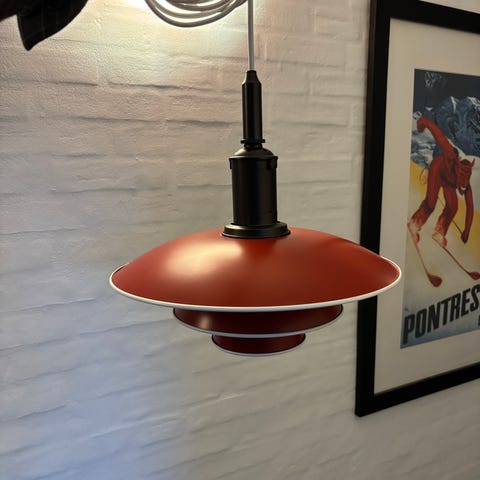 Louis Poulsen PH 3½-3 pendel designet af Poul Henningsen. Pendlen er udført i amberfarvet glas med detaljer i messing. Leveres i original emballage med vejledning. Velegnet som nedhængt belysning over f.eks. bord eller i opholdsrum. Anvender E27 fatning (ifølge mærkat på kassen).