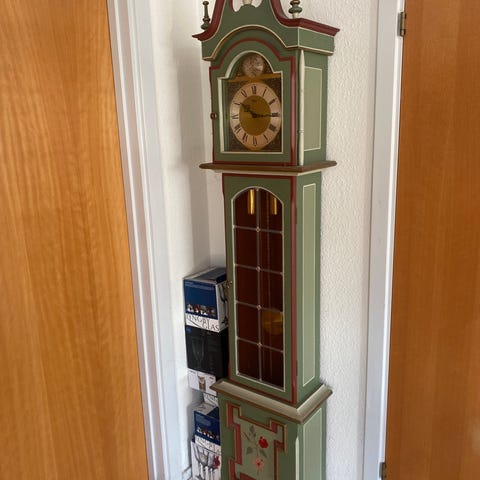 Uret er en høj, smal vægmodel med forseggjort dekoration, glasrude og detaljer i urskiven er meget smuk.