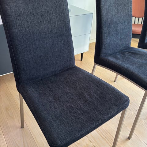 Superflotte og komfortable spisebordsstole i lysegråt stof. Med flot krom fod.