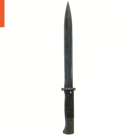 tyskBajonet med en længde på 39 cm, fremstillet af metal med en mørk overflade. Knivbladet er spidst og håndtaget har en struktureret greb for stabilitet. Bajonetten ser ud til at være et militært redskab eller samlerobjekt.orginalt fra 2 verdens kring