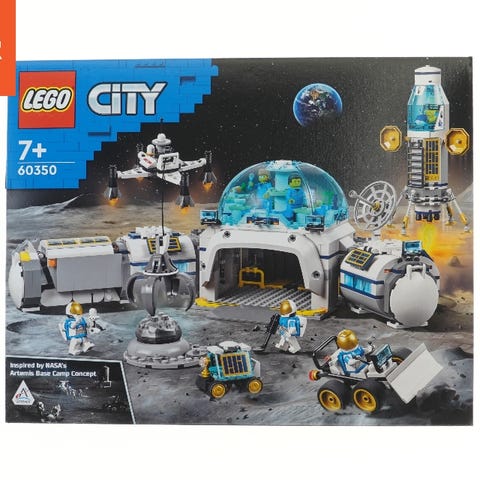 Dette er et LEGO City rumbase sæt, modelnummer 60350. Sættet inkluderer forskellige rumkøretøjer, astronautfigurer, og en rumstation inspireret af NASAs Artemis Base Camp koncept. Det er velegnet til børn fra 7 år og opefter, og måler 47,5x37 cm.