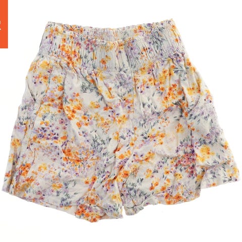 Et par blå og hvide stribede strandshorts med elastisk talje og orange snøre til justering. Der er en lille lomme med en dekorativ knap på bagsiden og et lille logo på forsiden. Shortsen er lavet af let materiale, der er velegnet til strandbrug.