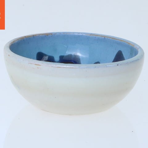 Skålen er en lille keramisk genstand med dimensionerne Ø 11x6 cm. Den har et unikt blomsterdesign med blå og beige nuancer. Den indvendige del er glaseret i en grå tone, mens ydersiden prydes med håndmalede blomster og blade, som giver den et rustikt udseende. Skålen er ideel til brug som dekoration eller til servering af små portioner af snacks eller saucer.