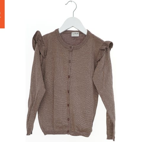 Rød trøje med grå krave og manchetter. Designet minder om en julekostume med et bælte printet omkring taljen i brun med gul spænde detalje.