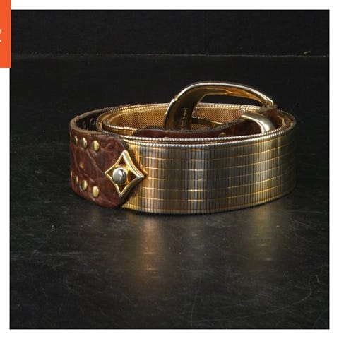 Dette er et flettet læderbælte med en længde på 90 cm. Bæltet har et metallisk gyldent spænde og en flerfarvet design, primært i brun og grønne nuancer, hvilket giver et rustikt og elegant udseende. Det er velegnet til daglig brug og kan kombineres med forskellige outfits.
