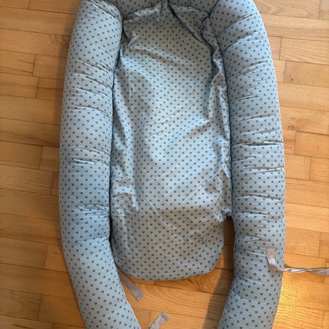 Babynest i beige med små sorte prikker. Det er designet til at give en sikker og komfortabel plads til spædbørn. Babynestet har en blød polstring hele vejen rundt og kan bindes sammen med snore for at justere størrelsen som ønsket.