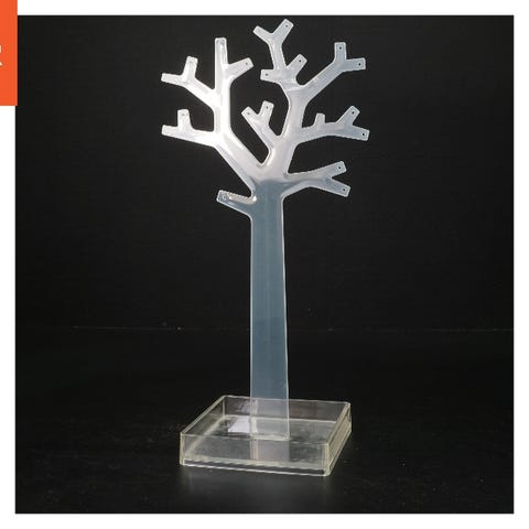 Smykkeholdere har et rundt spejl indrammet af lange metalstænger, hvilket giver det en solformet udseende. Basen er rektangulær og lavet af det samme materiale som solen, med en indbygget skuffe, der kan bruges til opbevaring. Objektet står på en pind, der forbinder solen med basen.