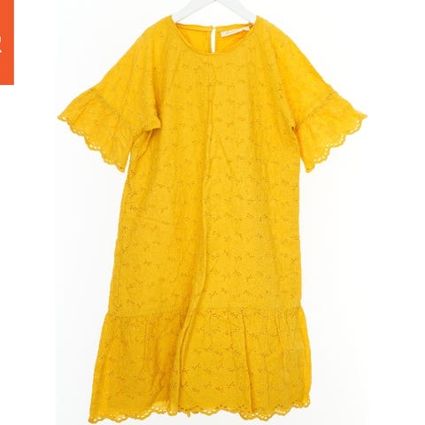 Kjolen har lange ærmer og er dekoreret med et blomstermønster i nuancer af blå. Den har en knaplukning bagpå og en lille kantlinje på brystet.