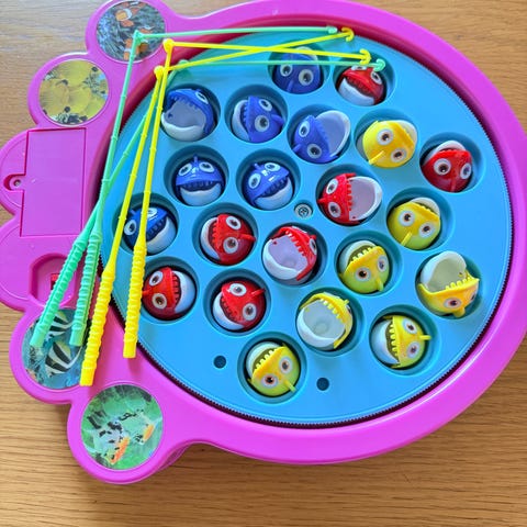 Elektronisk fiskespil med lilla base og gul overflade. Spillet består af små fisk og en snurrende bund, der simulerer fiskeri, når de medfølgende fiskestænger bruges. Basen er dekoreret med fiskemotiver og andet maritimt tema. Objektets diameter er 28 cm.