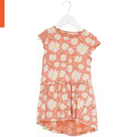 Grå ærmeløs børnekjole med skræddersyet plisseret design. Den præsenterer en broche detaljeret med en blomst foran og har en lynlås bagpå for nem lukning.