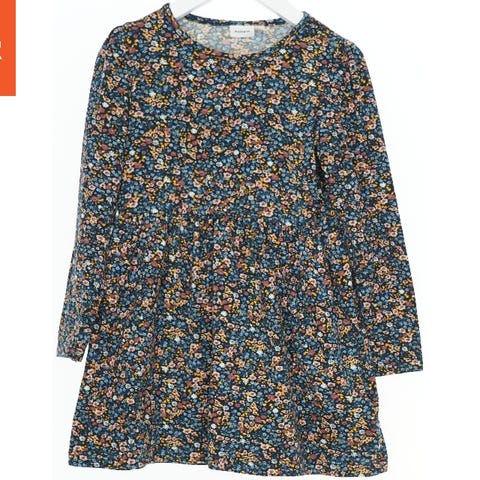 Kjolen har et blomstret design med forskellige farver. Den har korte ærmer og en løs pasform, som giver luft omkring benene. Materialet ser let og behageligt ud, passende til varmt vejr.