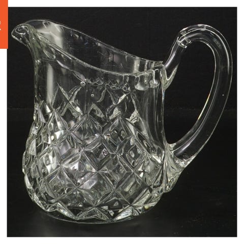 Denne unikke glaskande har en dekorativ overflade, der ligner druer i relief. Kanden har et håndtag og en prop, begge lavet af glas. Den er 37 cm høj og vil kunne bruges som dekoration i hjemmet.