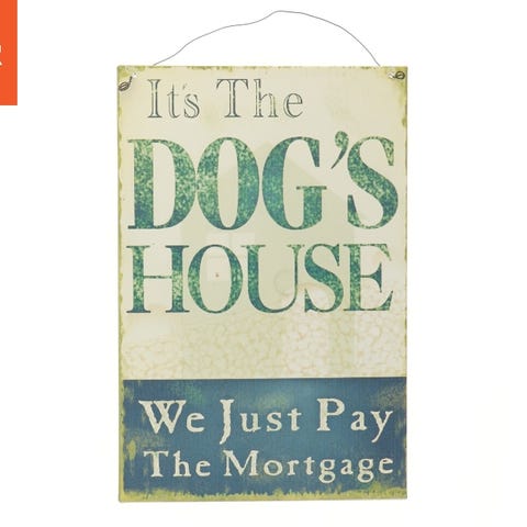 Skilt med en vintage-design, der måler 30x20 cm. Skiltet har et citat, der lyder 'A home without a dog is just a house' med en silhuet af en gravhund. Det har en tråd til ophængning og er lavet af metal. Bagsiden er ensfarvet uden yderligere design.