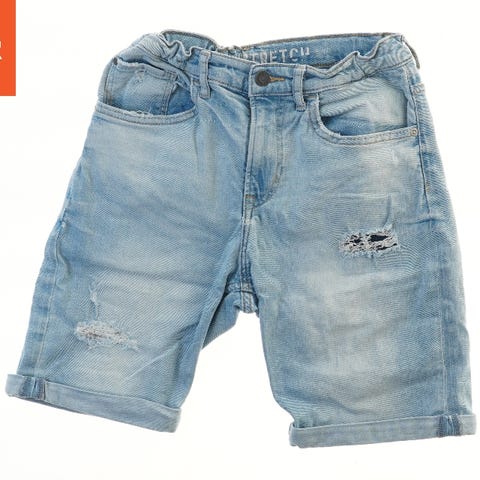Blå herreshorts med lynlås og knaplukning. Shortsene har lommer på siden og bagpå med knaplukning på baglommerne.